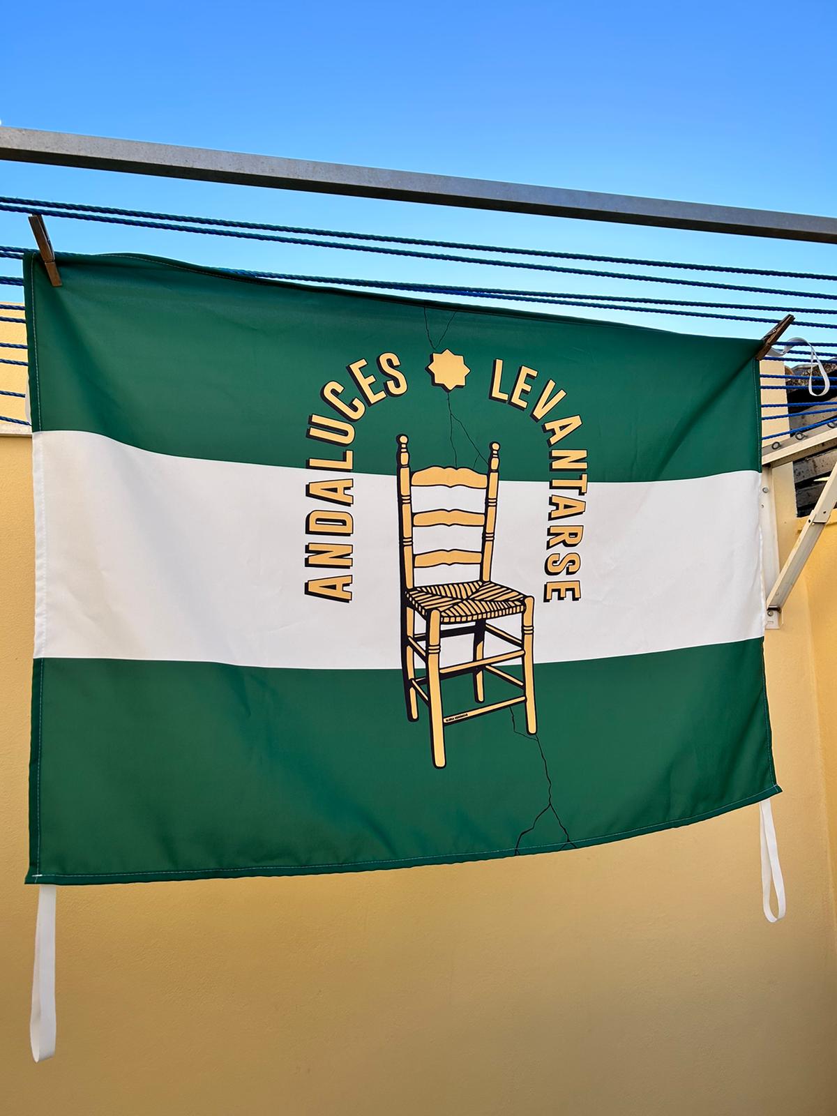 Diseño ‘Andaluces, levantarse’ de @carlos.cbl, reeditado para esta espectacular bandera balconera con lazos en las esquinas.
