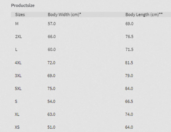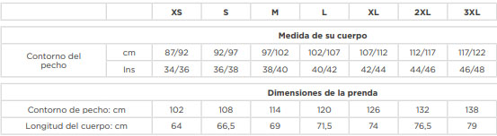 | Talla | XS, S, M, L, XL, XXL, 3XL |